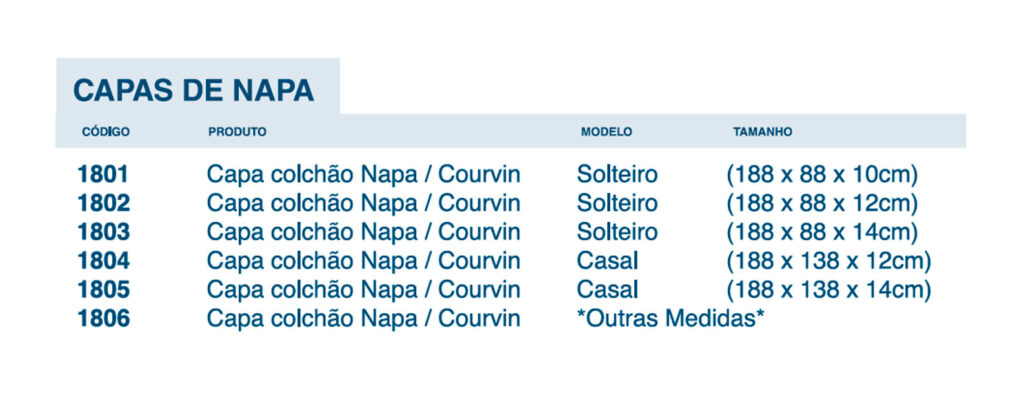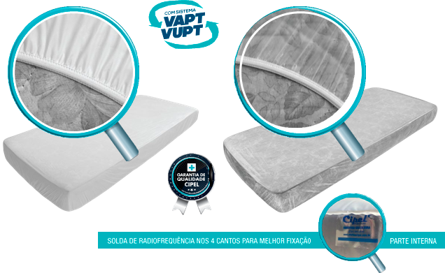 Fabricada com solda de rádio frequência. Possui zíper em toda lateral, facilitando a colocação ou remoção do colchão, além de respiros (dummies em silicone) que facilitam a circulação do ar, evitando o mofo.