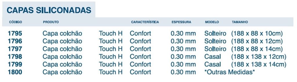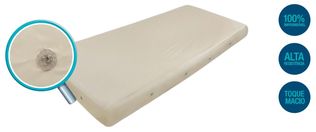 Fabricada com espessura de 0,08 à 0,13 mm, utiliza o PVC SILICONADO TOUCH H, o que proporciona maior conforto ao paciente, mantendo a eficácia do colchão na prevenção de escaras. Possui zíper em toda extensão lateral, facilitando a colocação e remoção do colchão, além de respiros (dummies flexíveis em silicone) que facilitam a circulação e deslocamento do ar.
