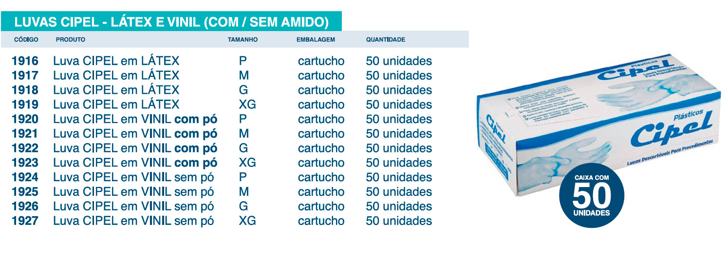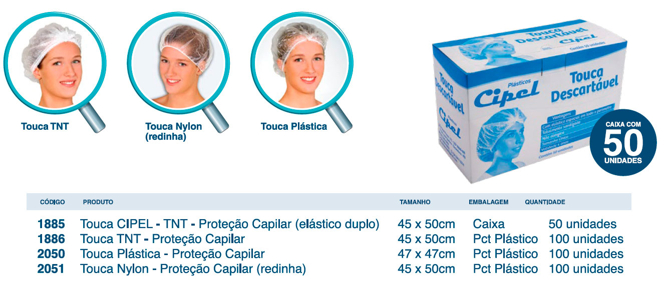 Os Produtos descartáveis da Cipel, são indispensáveis para profissionais que trabalham nas áreas da saúde, da beleza ou alimentícia, pois oferecem maior segurança para os pacientes, trabalhadores, clientes, em locais que necessitam de cuidados com limpeza e higiene, evitando a contaminação por fungos, bactérias, micoses, etc. Na área médica a utilização dos descartáveis é imprescindível, pois os riscos de contaminação são ainda maiores. Para atender esta demanda, a Cipel está trabalhando para ampliar sua gama dos produtos descartáveis, e em breve teremos uma linha completa para proteção individual.