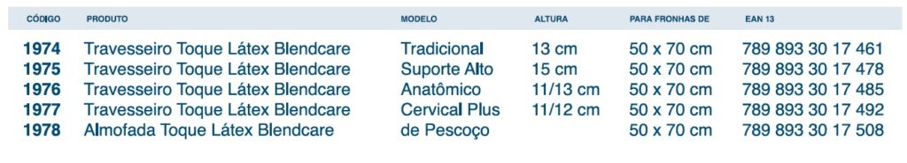 Produzido em espuma 100% poliuretano, o travesseiro BlendCare – Toque Látex proporciona a suavidade e a maciez do viscoelástico (NASA), aliada ao suporte e à elasticidade semelhante do Látex natural. Extremamente confortável permite a total sustentação da cabeça durante o sono, sendo especialmente indicado para pessoas que apreciam a maciez, porém necessitam de um travesseiro com um pouco mais de suporte.